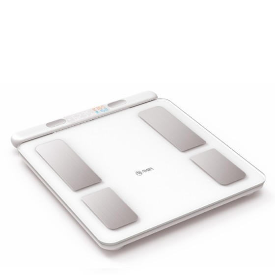Ζυγαριά σύνθεσης σώματος, με λαβή που περιλαμβάνει μεταλλικούς αισθητήρες, γυάλινη επιφάνεια με επίστρωση ITO και ασύρματη σύνδεση.